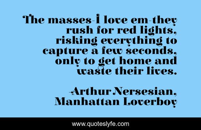 This page presents the quote "The masses-I love em-they rush for red lights, risking everything to capture a few seconds, only to get home and waste their lives.". Author of this quote is Arthur Nersesian, Manhattan Loverboy. .