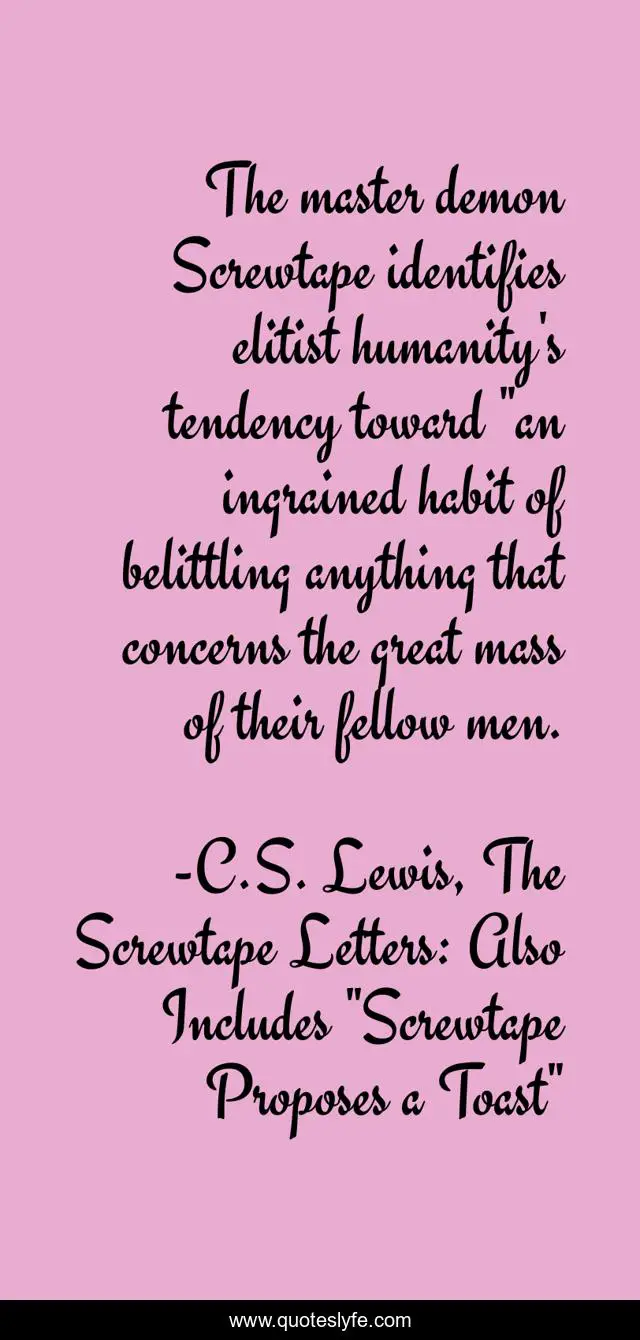 "C.S. Lewis, The Screwtape Letters: Also Includes "Screwtape Proposes a Toast" Quotes." Quoteslyfe.com, 2025. Mon. 08 Dec. 2025. <https://www.quoteslyfe.com/quote/The-master-demon-Screwtape-identifies-elitist-humanity-135501>.