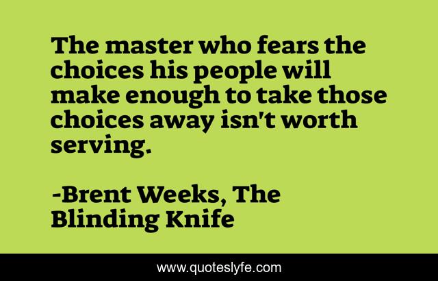 This page presents the quote "The master who fears the choices his people will make enough to take those choices away isn't worth serving.". Author of this quote is Brent Weeks, The Blinding Knife. .