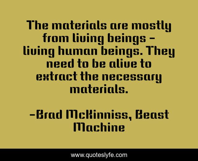 This page presents the quote "The materials are mostly from living beings - living human beings. They need to be alive to extract the necessary materials.". Author of this quote is Brad McKinniss, Beast Machine. This quote is about science-experiment, human-lives, science-fiction,.