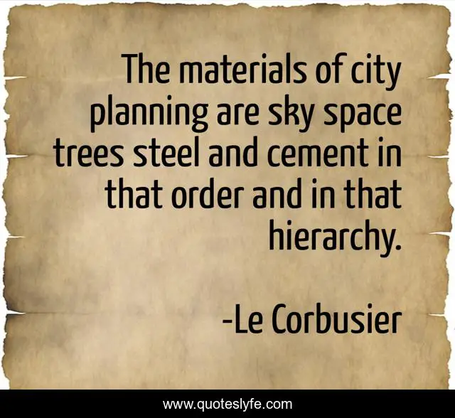 This page presents the quote "The materials of city planning are sky space trees steel and cement in that order and in that hierarchy.". Author of this quote is Le Corbusier. This quote is about architecture, architects,.
