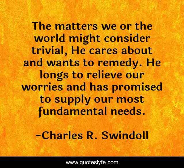 This page presents the quote "The matters we or the world might consider trivial, He cares about and wants to remedy. He longs to relieve our worries and has promised to supply our most fundamental needs.". Author of this quote is Charles R. Swindoll. This quote is about god, provision,.