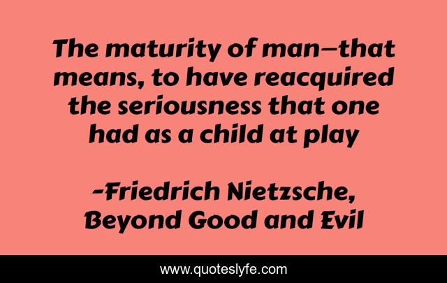 This page presents the quote "The maturity of man—that means, to have reacquired the seriousness that one had as a child at play". Author of this quote is Friedrich Nietzsche, Beyond Good and Evil. .
