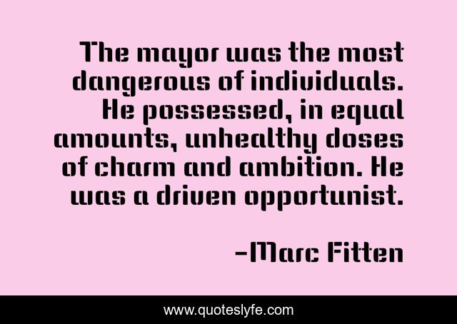 This page presents the quote "The mayor was the most dangerous of individuals. He possessed, in equal amounts, unhealthy doses of charm and ambition. He was a driven opportunist.". Author of this quote is Marc Fitten. This quote is about dangerous, charm, ambition,.