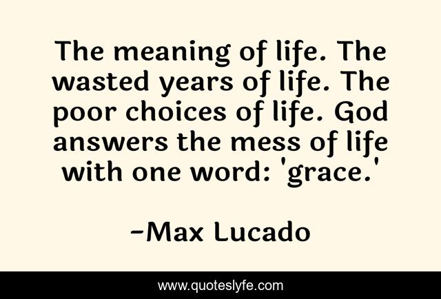 This page presents the quote "The meaning of life. The wasted years of life. The poor choices of life. God answers the mess of life with one word: 'grace.'". Author of this quote is Max Lucado. This quote is about life, grace, choices,.