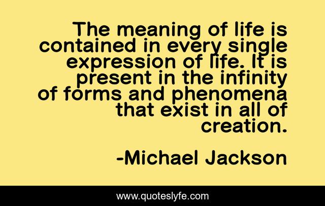 This page presents the quote "The meaning of life is contained in every single expression of life. It is present in the infinity of forms and phenomena that exist in all of creation.". Author of this quote is Michael Jackson. This quote is about meaning of life, meaning,.