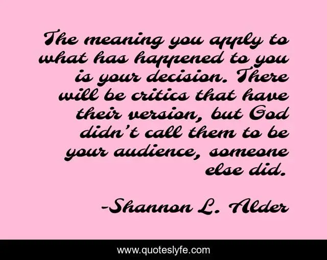 This page presents the quote "The meaning you apply to what has happened to you is your decision. There will be critics that have their version, but God didn’t call them to be your audience, someone else did.". Author of this quote is Shannon L. Alder. This quote is about critics, audience, satan,.