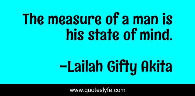 This page presents the quote "The measure of a man is his state of mind.". Author of this quote is Lailah Gifty Akita. This quote is about inner-strength, measure, mind, willpower, wisdom,.