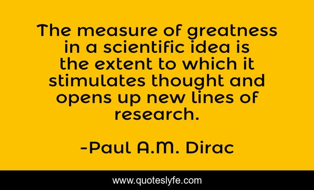This page presents the quote "The measure of greatness in a scientific idea is the extent to which it stimulates thought and opens up new lines of research.". Author of this quote is Paul A.M. Dirac. This quote is about thought, science, greatness, idea, research,.