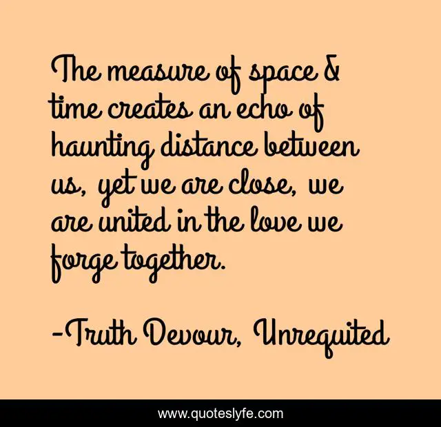 This page presents the quote "The measure of space & time creates an echo of haunting distance between us, yet we are close, we are united in the love we forge together.". Author of this quote is Truth Devour, Unrequited. This quote is about faith, love, kindred-spirits, joy, karmic, soul, romance, twin-flames, sated,.