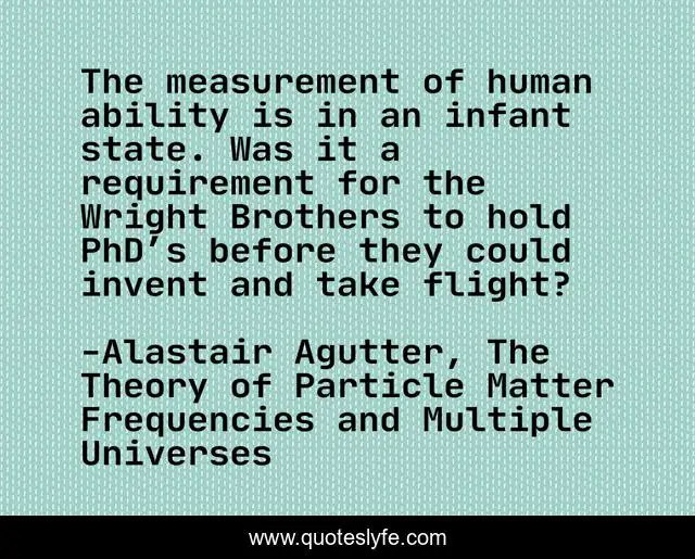 This page presents the quote "The measurement of human ability is in an infant state. Was it a requirement for the Wright Brothers to hold PhD’s before they could invent and take flight?". Author of this quote is Alastair Agutter, The Theory of Particle Matter Frequencies and Multiple Universes. .