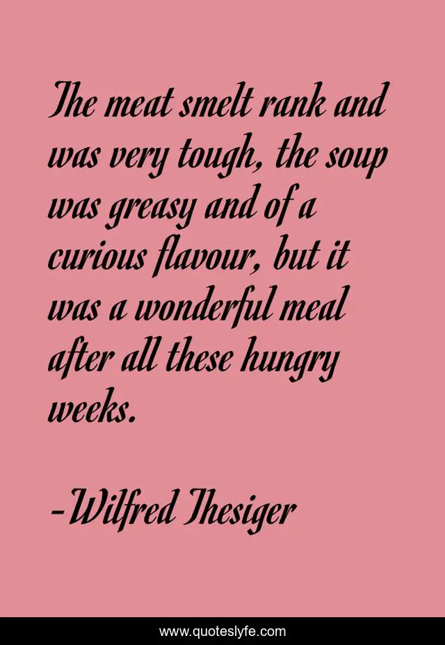 This page presents the quote "The meat smelt rank and was very tough, the soup was greasy and of a curious flavour, but it was a wonderful meal after all these hungry weeks.". Author of this quote is Wilfred Thesiger. This quote is about food, hunger,.