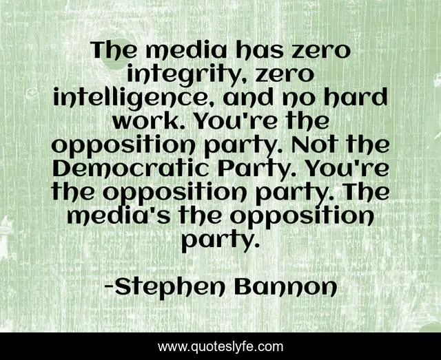 This page presents the quote "The media has zero integrity, zero intelligence, and no hard work. You're the opposition party. Not the Democratic Party. You're the opposition party. The media's the opposition party.". Author of this quote is Stephen Bannon. This quote is about work, integrity, hard work,.