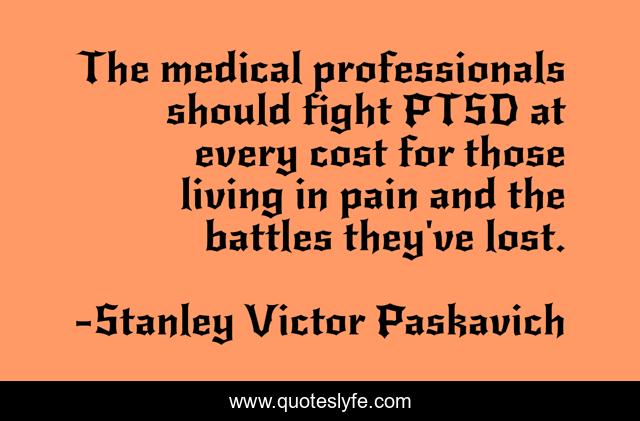 This page presents the quote "The medical professionals should fight PTSD at every cost for those living in pain and the battles they've lost.". Author of this quote is Stanley Victor Paskavich. This quote is about suffering, pain, ptsd,.