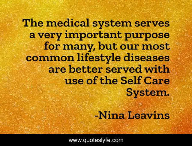 This page presents the quote "The medical system serves a very important purpose for many, but our most common lifestyle diseases are better served with use of the Self Care System.". Author of this quote is Nina Leavins. This quote is about nutrition, fitness, health, self-care, wellness,.