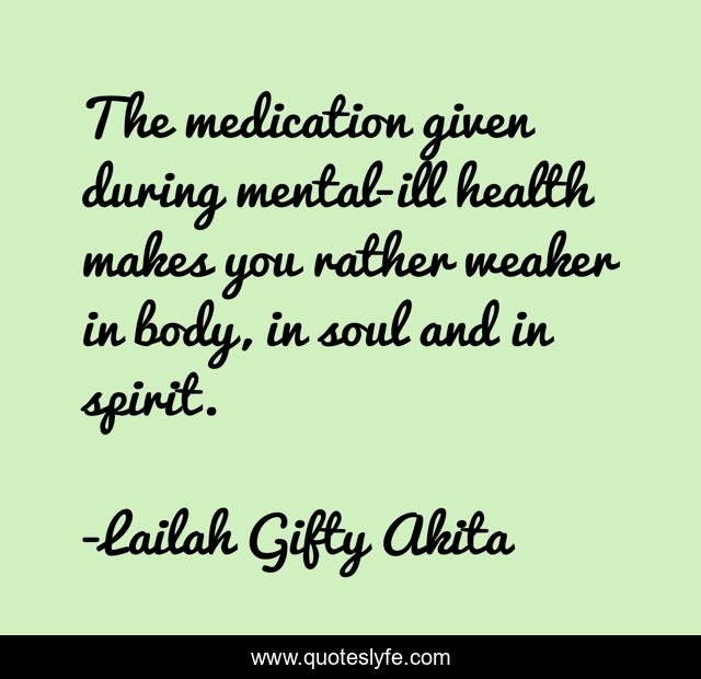 This page presents the quote "The medication given during mental-ill health makes you rather weaker in body, in soul and in spirit.". Author of this quote is Lailah Gifty Akita. This quote is about illness, lailah-gifty-akita-affirmations, schizophrenia, mental-health, medication, illusion,.