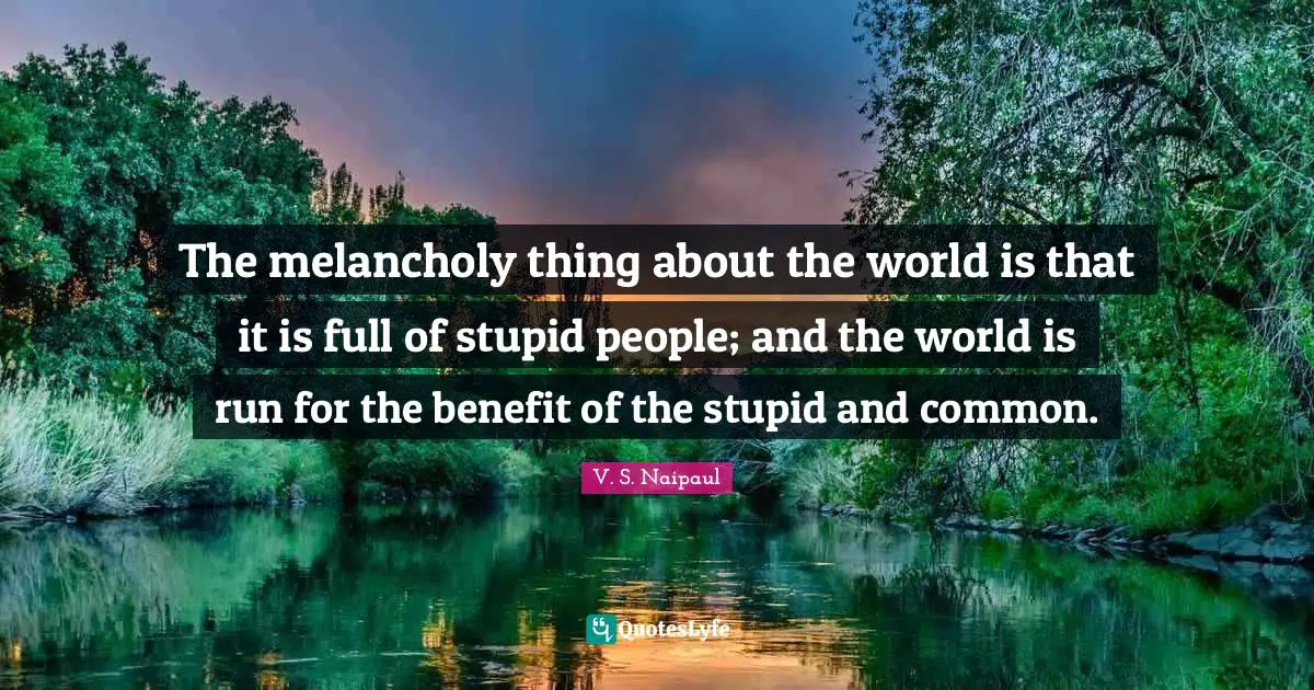 This page presents the quote "The melancholy thing about the world is that it is full of stupid people; and the world is run for the benefit of the stupid and common.". Author of this quote is V. S. Naipaul. This quote is about stupid, stupid people, people, melancholy, common, running, world,.