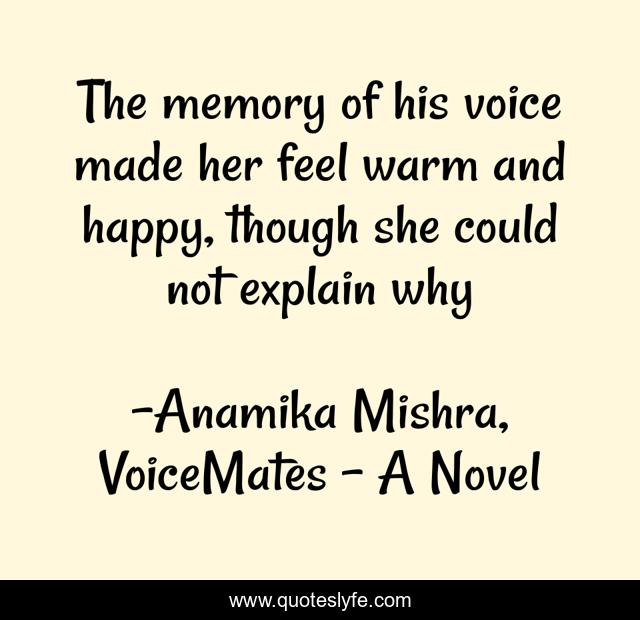 This page presents the quote "The memory of his voice made her feel warm and happy, though she could not explain why". Author of this quote is Anamika Mishra, VoiceMates - A Novel. This quote is about beautiful, life, love, voicemates, memory, voice, affection,.