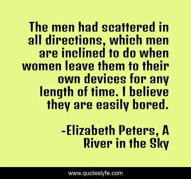 This page presents the quote "The men had scattered in all directions, which men are inclined to do when women leave them to their own devices for any length of time. I believe they are easily bored.". Author of this quote is Elizabeth Peters, A River in the Sky. This quote is about amelia-peabody, men, humor,.