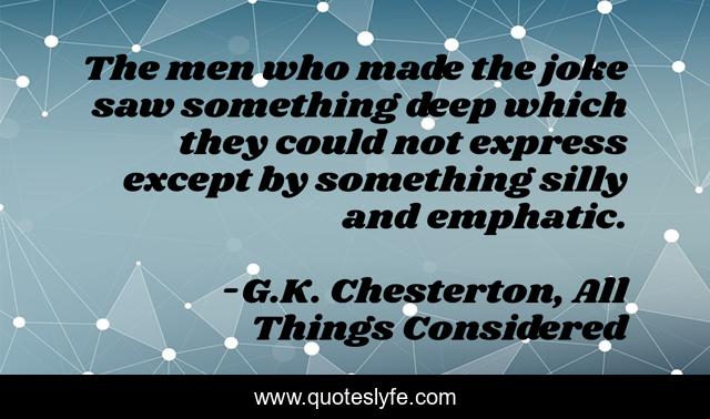 This page presents the quote "The men who made the joke saw something deep which they could not express except by something silly and emphatic.". Author of this quote is G.K. Chesterton, All Things Considered. This quote is about seriousness, humour, humor, humanity, language,.