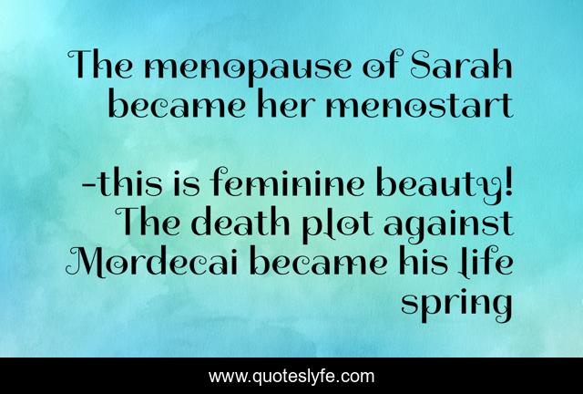 This page presents the quote "The menopause of Sarah became her menostart". Author of this quote is this is feminine beauty! The death plot against Mordecai became his life spring. .