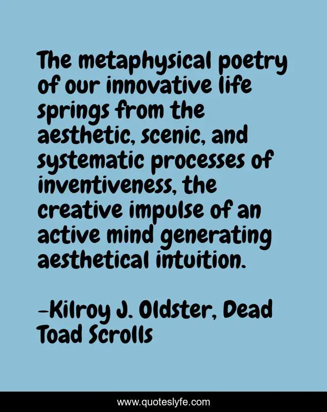 This page presents the quote "The metaphysical poetry of our innovative life springs from the aesthetic, scenic, and systematic processes of inventiveness, the creative impulse of an active mind generating aesthetical intuition.". Author of this quote is Kilroy J. Oldster, Dead Toad Scrolls. This quote is about intuition, self-awareness, self-knowledge, thinking, mind, memoir-writing, writing, writers-on-thinking, story-of-my-life,.