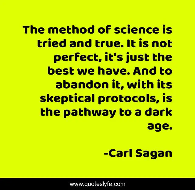 This page presents the quote "The method of science is tried and true. It is not perfect, it's just the best we have. And to abandon it, with its skeptical protocols, is the pathway to a dark age.". Author of this quote is Carl Sagan. This quote is about perfect, scepticism, science, scientific-method, dark-age, skepticism, true, method, best,.