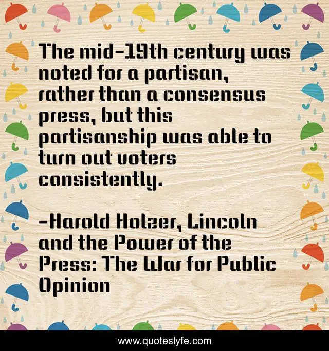 This page presents the quote "The mid-19th century was noted for a partisan, rather than a consensus press, but this partisanship was able to turn out voters consistently.". Author of this quote is Harold Holzer, Lincoln and the Power of the Press: The War for Public Opinion. This quote is about partisanship, motivation, leadership, nostalgia,.