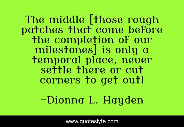 This page presents the quote "The middle [those rough patches that come before the completion of our milestones] is only a temporal place, never settle there or cut corners to get out!". Author of this quote is Dionna L. Hayden. This quote is about faith, guidance, growth, life, inspiration,.