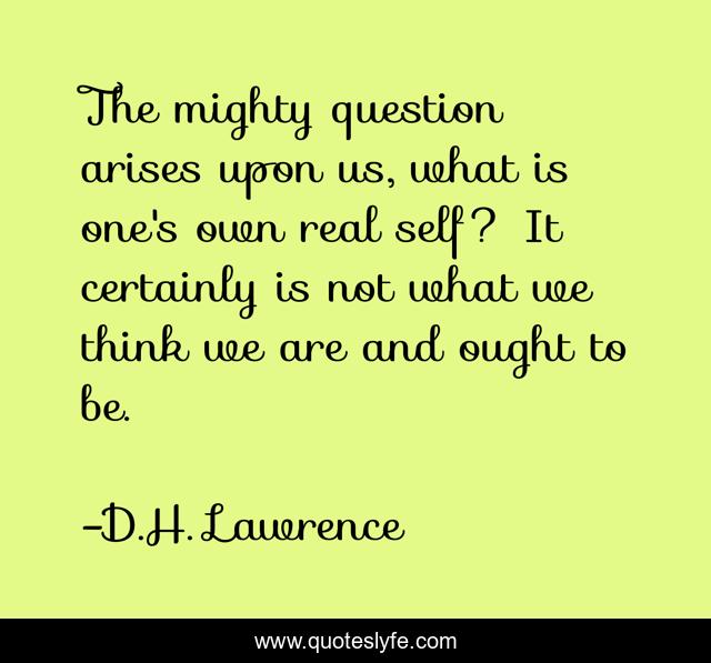 This page presents the quote "The mighty question arises upon us, what is one's own real self? It certainly is not what we think we are and ought to be.". Author of this quote is D.H. Lawrence. .