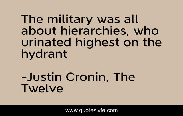 This page presents the quote "The military was all about hierarchies, who urinated highest on the hydrant". Author of this quote is Justin Cronin, The Twelve. .