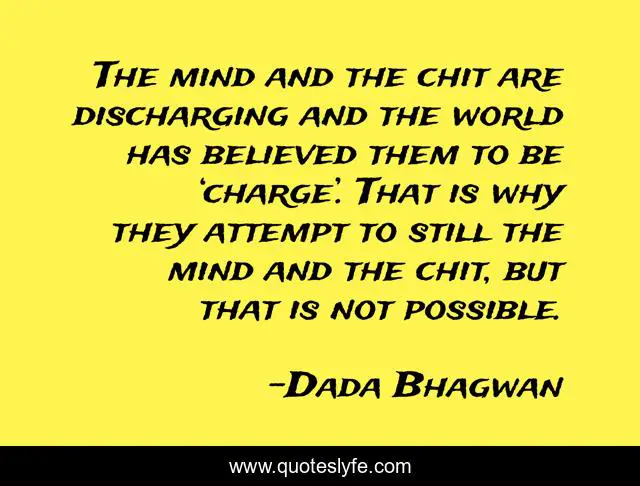 This page presents the quote "The mind and the chit are discharging and the world has believed them to be ‘charge’. That is why they attempt to still the mind and the chit, but that is not possible.". Author of this quote is Dada Bhagwan. This quote is about spiritual, mind, chit, still-the-mind, charge, discharge,.