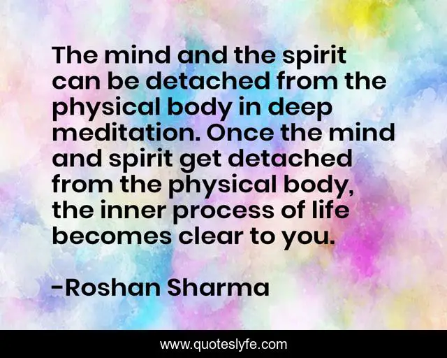 This page presents the quote "The mind and the spirit can be detached from the physical body in deep meditation. Once the mind and spirit get detached from the physical body, the inner process of life becomes clear to you.". Author of this quote is Roshan Sharma. This quote is about body, metaphysical, mind, meditation, astral, spirit,.