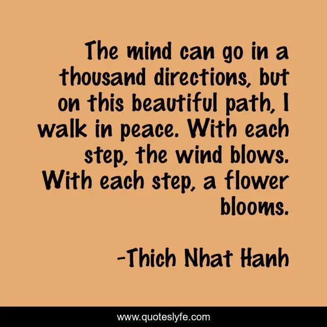 This page presents the quote "The mind can go in a thousand directions, but on this beautiful path, I walk in peace. With each step, the wind blows. With each step, a flower blooms.". Author of this quote is Thich Nhat Hanh. This quote is about meditation, peace, mind, step, beauty,.