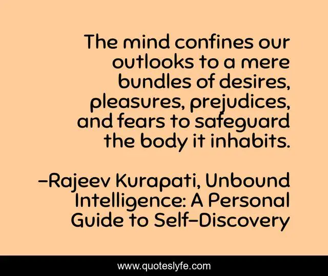 This page presents the quote "The mind confines our outlooks to a mere bundles of desires, pleasures, prejudices, and fears to safeguard the body it inhabits.". Author of this quote is Rajeev Kurapati, Unbound Intelligence: A Personal Guide to Self-Discovery. This quote is about desire, love, mindfulness, god, mind, mind-body-spirit, pleasure, affection,.