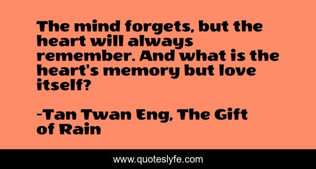 This page presents the quote "The mind forgets, but the heart will always remember. And what is the heart's memory but love itself?". Author of this quote is Tan Twan Eng, The Gift of Rain. This quote is about heart, mind, affection, love, memory,.