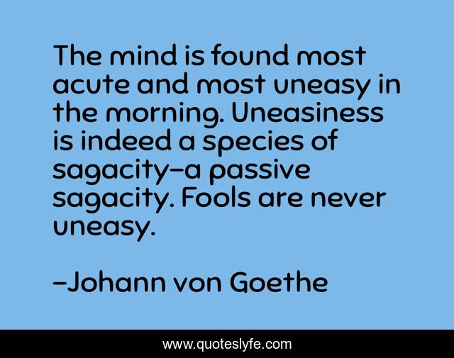 This page presents the quote "The mind is found most acute and most uneasy in the morning. Uneasiness is indeed a species of sagacity-a passive sagacity. Fools are never uneasy.". Author of this quote is Johann von Goethe. .