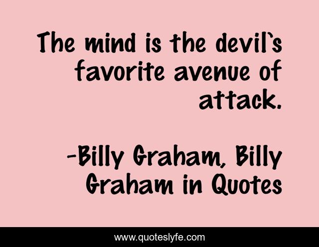 This page presents the quote "The mind is the devil’s favorite avenue of attack.". Author of this quote is Billy Graham, Billy Graham in Quotes. This quote is about devil, satan, billy-graham,.