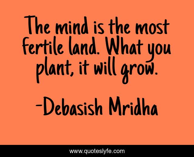This page presents the quote "The mind is the most fertile land. What you plant, it will grow.". Author of this quote is Debasish Mridha. This quote is about debasish, debasish-mridha, philosophy, mind, fertile-land, it-will-grow, inspirational, mridha, enthusiasm,.