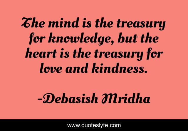 This page presents the quote "The mind is the treasury for knowledge, but the heart is the treasury for love and kindness.". Author of this quote is Debasish Mridha. This quote is about knowledge, love-and-kindness, mind, philosophy, debasish-mridha, quotes, inspirational, enthusiasm, education,.