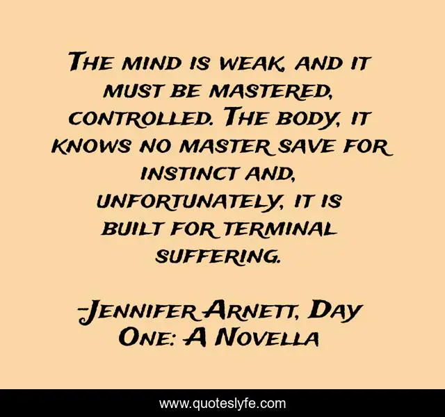 This page presents the quote "The mind is weak, and it must be mastered, controlled. The body, it knows no master save for instinct and, unfortunately, it is built for terminal suffering.". Author of this quote is Jennifer Arnett, Day One: A Novella. This quote is about body, controlled, mind, weak, suffering, mastered, instinct,.
