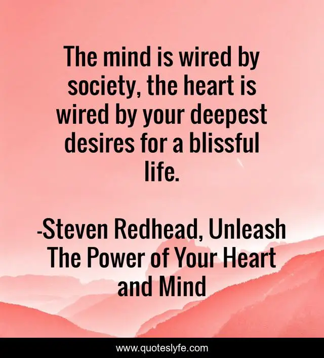 This page presents the quote "The mind is wired by society, the heart is wired by your deepest desires for a blissful life.". Author of this quote is Steven Redhead, Unleash The Power of Your Heart and Mind. This quote is about heart, life, desires, mind, society, blissful,.