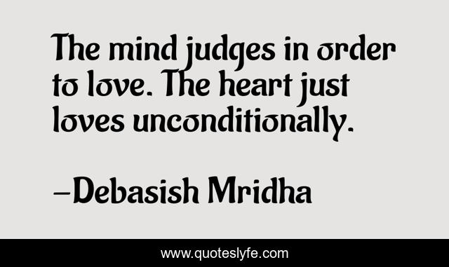 This page presents the quote "The mind judges in order to love. The heart just loves unconditionally.". Author of this quote is Debasish Mridha. This quote is about heart, judges, philosophy, love, debasish-mridha, debasish, mind, loves-unconditionally, mridha,.