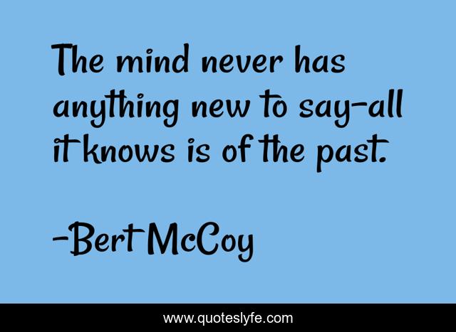 This page presents the quote "The mind never has anything new to say-all it knows is of the past.". Author of this quote is Bert McCoy. This quote is about the-now, now, enlightenment, freedom-from-the-known, presence, peace, present-moment, peace-of-mind, ind,.
