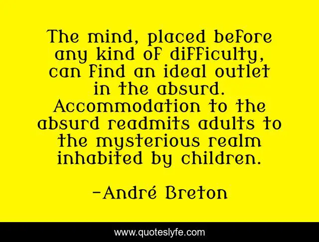 This page presents the quote "The mind, placed before any kind of difficulty, can find an ideal outlet in the absurd. Accommodation to the absurd readmits adults to the mysterious realm inhabited by children.". Author of this quote is André Breton. This quote is about absurdity, absurd, childhood,.