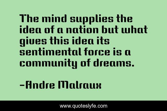 This page presents the quote "The mind supplies the idea of a nation but what gives this idea its sentimental force is a community of dreams.". Author of this quote is Andre Malraux. This quote is about patriotism, nationalism,.