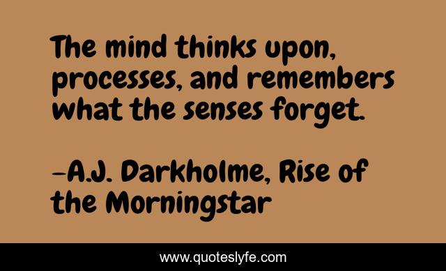 This page presents the quote "The mind thinks upon, processes, and remembers what the senses forget.". Author of this quote is A.J. Darkholme, Rise of the Morningstar. This quote is about remembrance, thinking, processing, mind, awareness,.