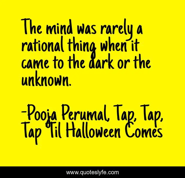 This page presents the quote "The mind was rarely a rational thing when it came to the dark or the unknown.". Author of this quote is Pooja Perumal, Tap, Tap, Tap 'Til Halloween Comes. This quote is about dark, irrational-fears, mind, rational, unknown,.