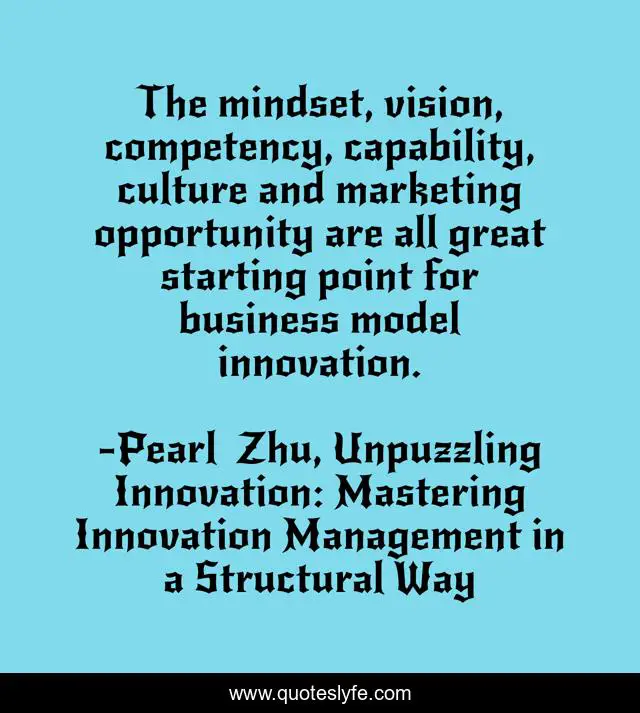 This page presents the quote "The mindset, vision, competency, capability, culture and marketing opportunity are all great starting point for business model innovation.". Author of this quote is Pearl Zhu, Unpuzzling Innovation: Mastering Innovation Management in a Structural Way. This quote is about creativity, innovation,.