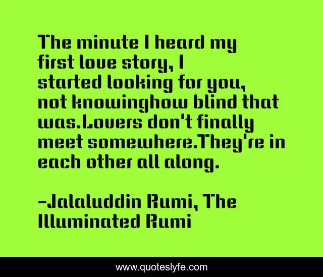 This page presents the quote "The minute I heard my first love story, I started looking for you, not knowinghow blind that was.Lovers don't finally meet somewhere.They're in each other all along.". Author of this quote is Jalaluddin Rumi, The Illuminated Rumi. .